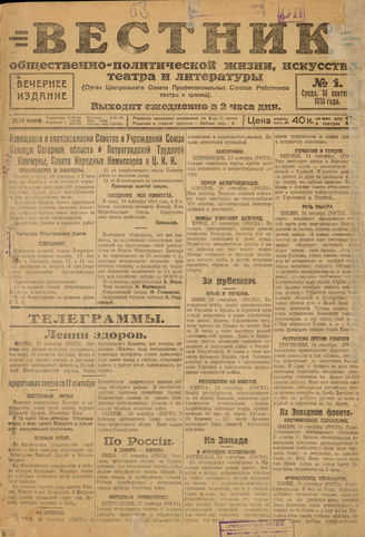 Вестник общественно-политической жизни, искусства, театра и литературы : орган ЦСПС работников театра и зрелищ : вечернее издание. - М., 1918 - . - Периодичность не определена.